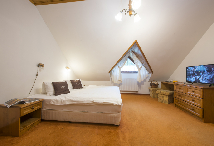 Hotel´s original 21 m2 attic rooms resemble the atmosphere of the other home by their cosiness directly in the mountains. Without any doubt, they meet all the requirements of comfortable living. Rooms offer plenty of space for partners and a comfortable bed takes care of undisturbed sleep. Enjoy the nature of the Low Tatras. These rooms offer the possibility of a double bed, separate beds - some with extra beds.