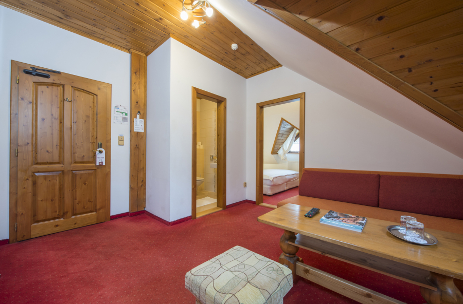 Two rooms separated by door. Bedroom part with double bed and living room with sofa bed - available to be made as an extra bed, which is the perfect combination of privacy and holiday together. Apartments are located on the second - original hotel floor - attic rooms. Suitable for families with children.
