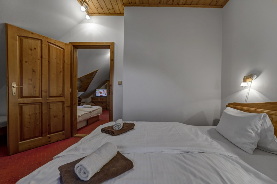 Dve izby oddelené dverami. Spálňová časť s manželskou posteľou a obývačka s rozkladacím gaučom - ako možnosť prístelky je dokonalým spojením súkromia a spoločnej dovolenky. Apartmány sa nachádzajú na druhom - pôvodonom poschodí - podkrovné izby. Vhodné pre rodiny s deťmi.