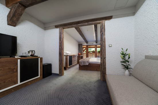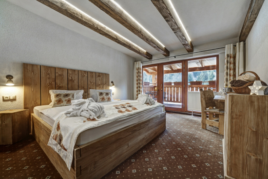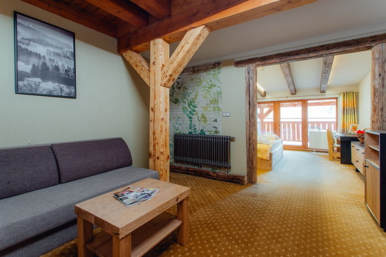 V Rodinnom Apartmáne je oddelená spálňová a obývacia časť s priestranným balkónom. Nachádza sa tu manželské lôžko a 1 rozťahovací gauč, ktorý je možné použiť ako prístelku pre 2 dospelé osoby alebo 2 deti do 12 r..